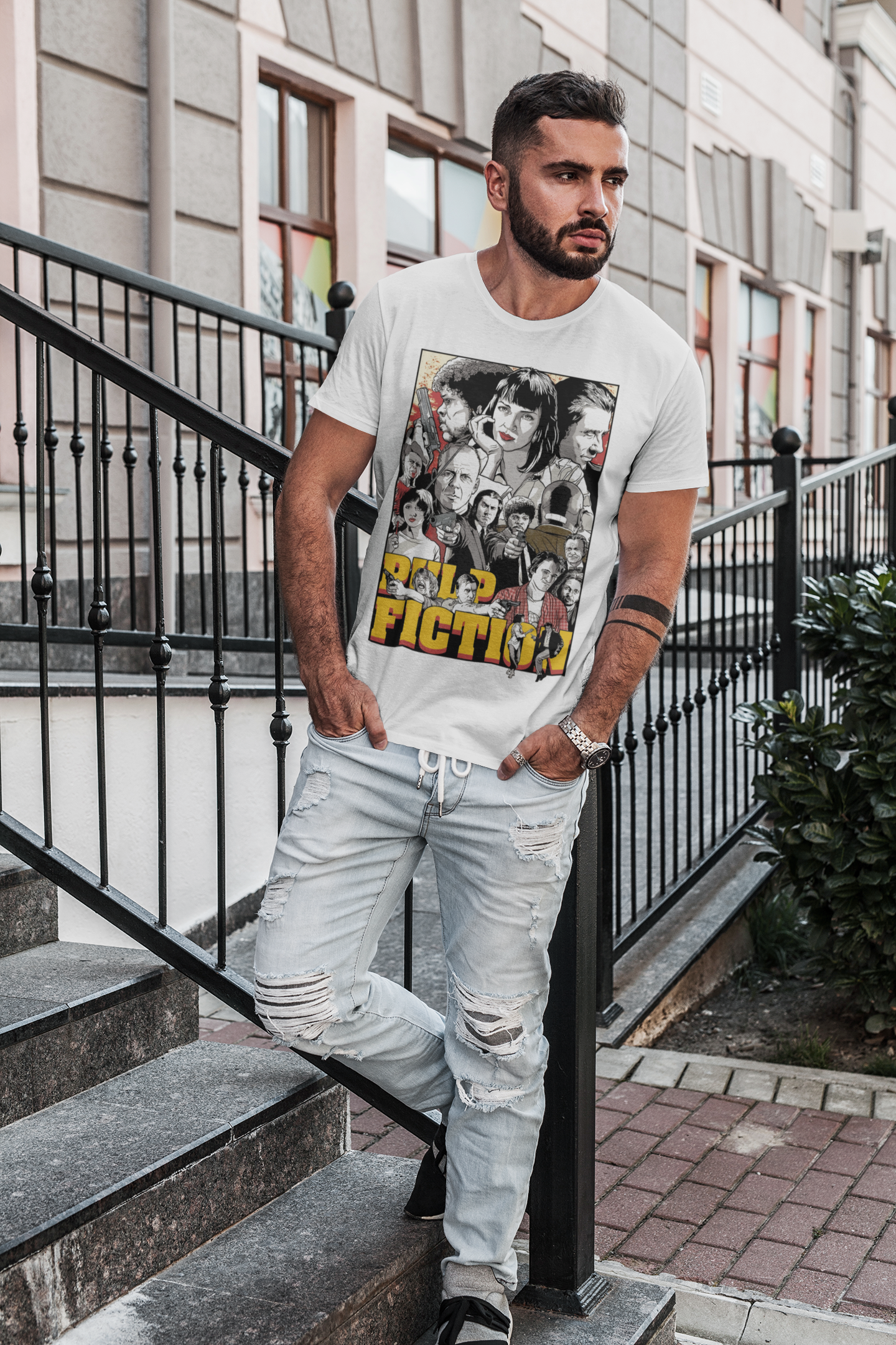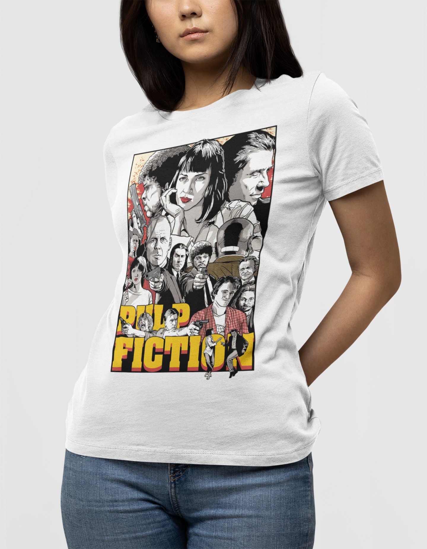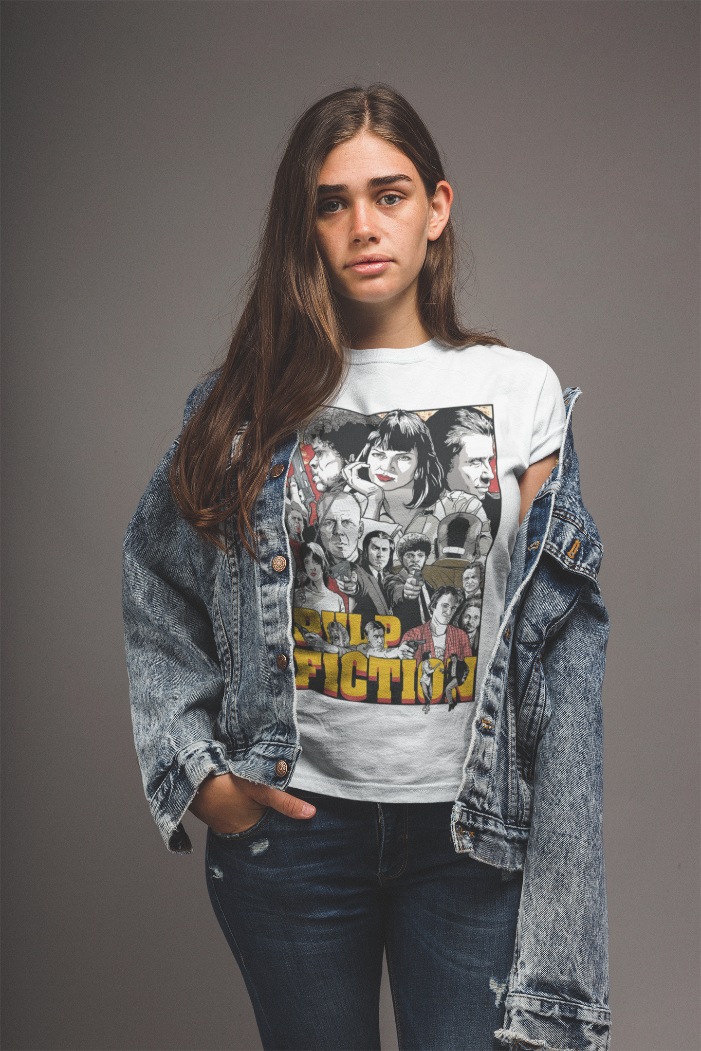 Celebra la genialidad de Quentin Tarantino con esta camiseta blanca de Pulp Fiction. Un diseño lleno de estilo retro que reúne a los personajes más icónicos de esta obra maestra.