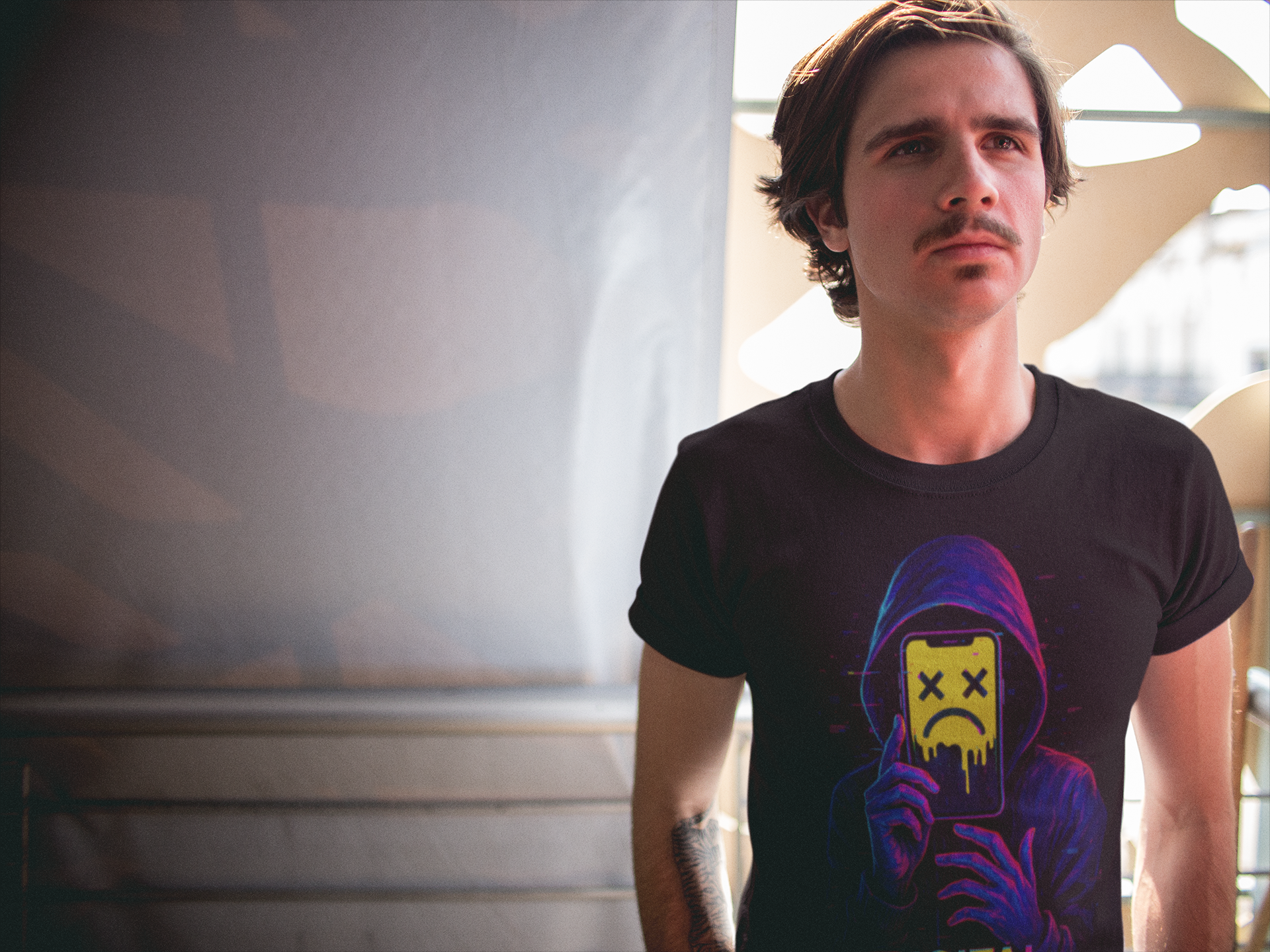 El diseño muestra una figura encapuchada sosteniendo un teléfono con una expresión distorsionada, representando la tristeza digital, el vacío emocional y la identidad fragmentada en redes sociales. Su estilo visual combina influencias de dark art, arte urbano, glitch art y estética tatuaje contemporánea.