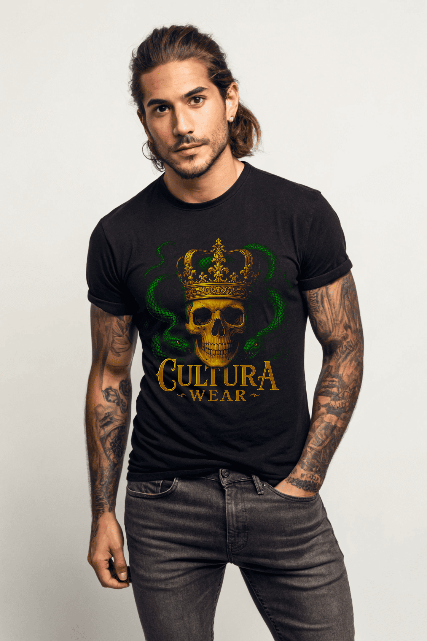 Despierta tu lado más oscuro con esta poderosa playera de la colección “Tatuaje y Dark Art” de Cultura Wear. El diseño combina una calavera coronada con serpientes verdes que emergen como guardianas del inframundo. Un símbolo de poder, muerte y misticismo. Impresa sobre algodón premium en corte oversized, perfecta para quienes desafían lo convencional.
