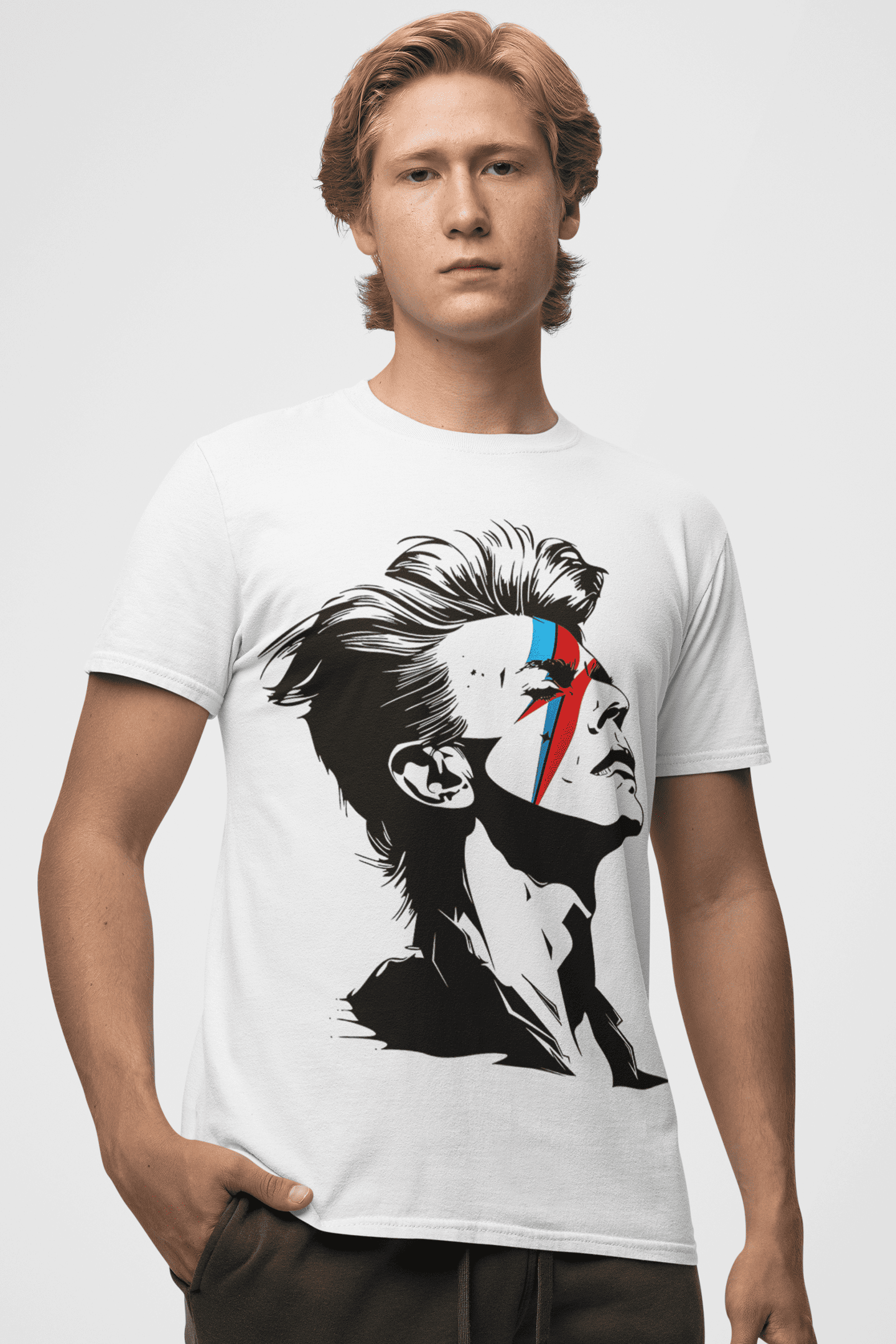 Explora el espíritu del glam rock con esta playera inspirada en una de las figuras más icónicas de la historia musical. El diseño minimalista en blanco y negro con un rayo rojo y azul evoca rebeldía, creatividad y un legado que trasciende generaciones. Perfecta para quienes viven el arte, la música y la autenticidad sin etiquetas. Disponible en corte para hombre y mujer. Ideal para fans del estilo alternativo, vintage y retro. confort.