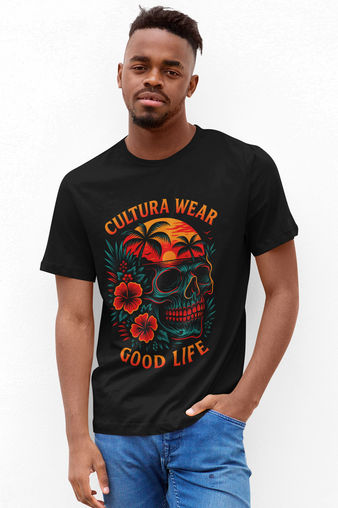 Esta pieza forma parte de la colección "Good Life" de Cultura Wear, donde el arte del tatuaje se encuentra con el espíritu libre. El diseño está inspirado en el estilo del Old School Tropical Tattoo, destacando líneas gruesas, colores vibrantes como rojos, verdes y naranjas intensos, y una composición que equilibra la muerte con la belleza natural. La calavera está enmarcada por hibiscos, palmeras y un atardecer caribeño, en un guiño visual al contraste entre la vida y la muerte. Una prenda poderosa para quienes se sienten cómodos habitando la oscuridad con color.