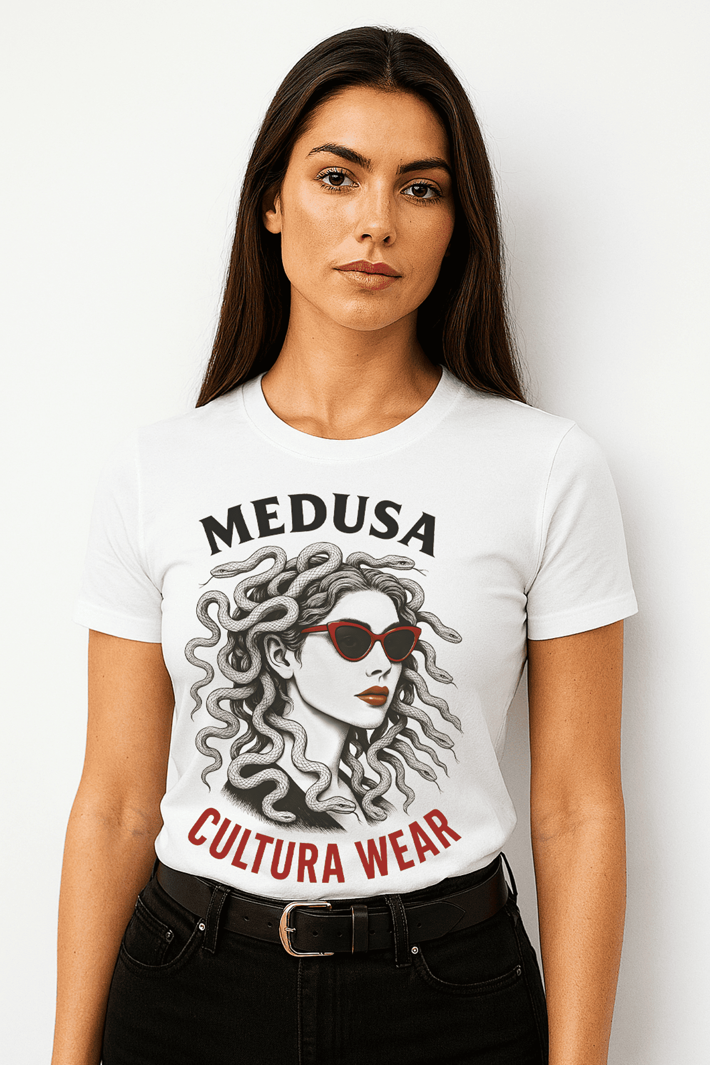 Esta playera presenta a Medusa reinterpretada en clave moderna, luciendo unas gafas rojas que contrastan con su mirada petrificante. El diseño está inspirado en el estilo neotradicional y blackwork, con líneas limpias, sombreado detallado y una paleta de blanco, negro y rojo que resalta su energía oscura y femenina. Ideal para quienes aprecian la simbología gótica, el poder mitológico y el arte corporal. Parte de nuestra colección Tatuaje y Dark Art de Cultura Wear, es una declaración de estilo con actitud.